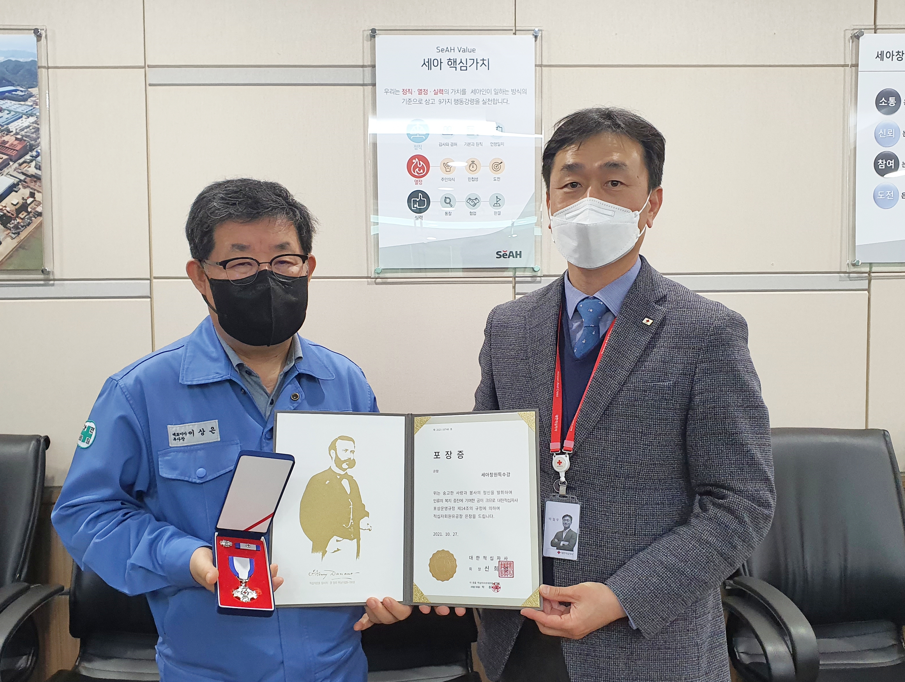 세아창원특수강이 대한적십자사 경남지사로부터 적십자사 회원유공장 은장을 받았다.