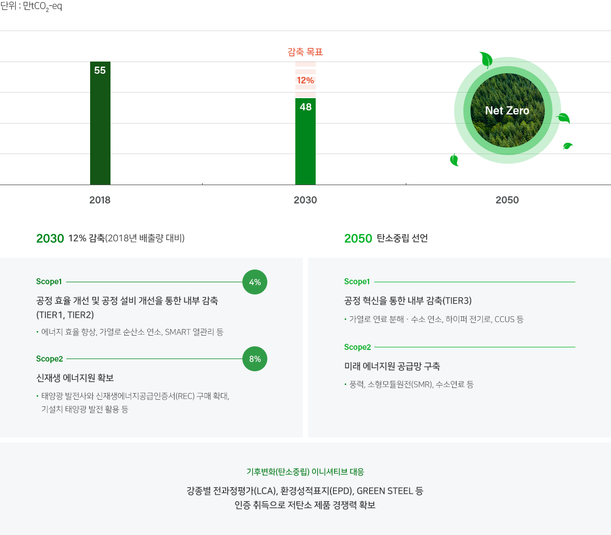 2030년까지 탄소배출량 12% 감축하는 목표를 시작으로, 2050년 탄소중립 달성을 위한 경영체계를 구축하고 있습니다.