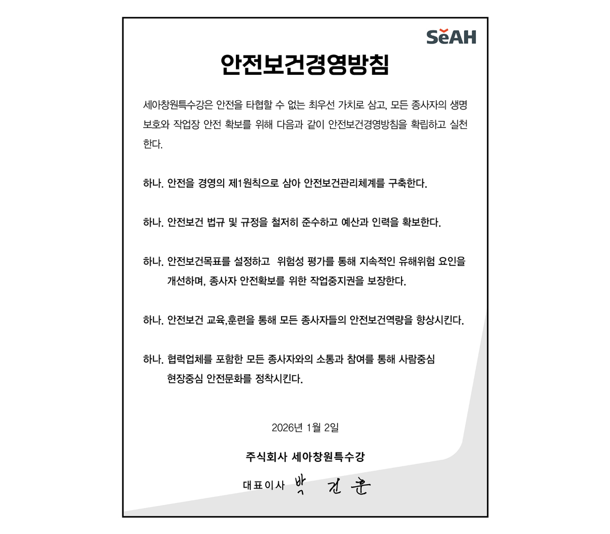 세아창원특수강은 직원들의 ‘안전’을 회사 운영에 있어서 가장 기본적인 경영이념으로 삼고 있으며,